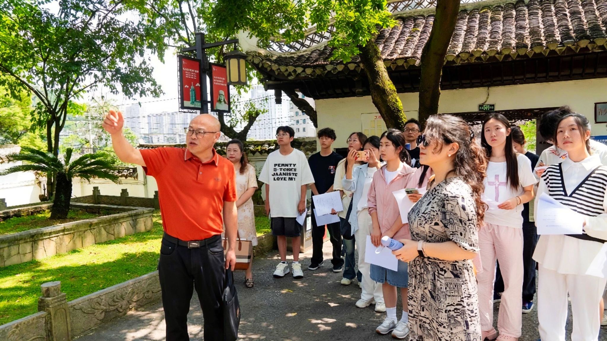在古松掩映的阳明祠前,教师结合课程内容,对王阳明立德立功立言的“三不朽”人生及其“心即理”“知行合一”“致良知”等思想进行讲解,在实景中深化对阳明心学的理解。