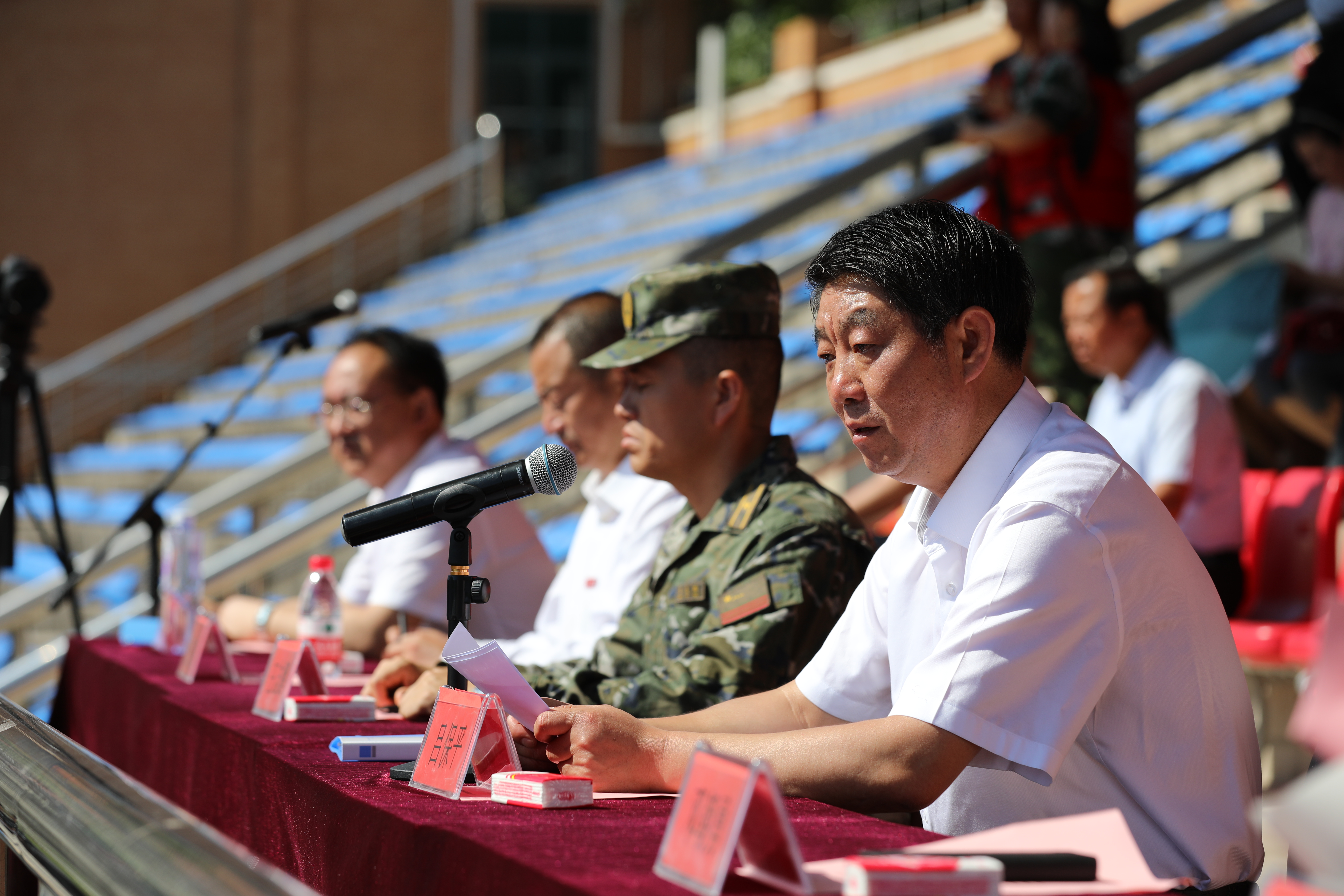 针对本次军训工作,他提出三点要求,一是全体带训干部要严格要求自己,发挥模范带头作用。二是全体带训干部和师生要牢固树立安全第一的思想。安全问题无小事,来不得丝毫懈怠。三是全体参训同学要以饱满的热情和高昂的斗志投入训练。“军”是世上最刚强、最豪勇的字眼,希望同学们自觉将校园当军营,自觉向教官看齐,虚心向人民解放军学习,秉承军人般刚强的意志,以高度的荣誉感、责任感和使命感对待这次军训,认真参训,力求精神、品格、体魄大丰收。