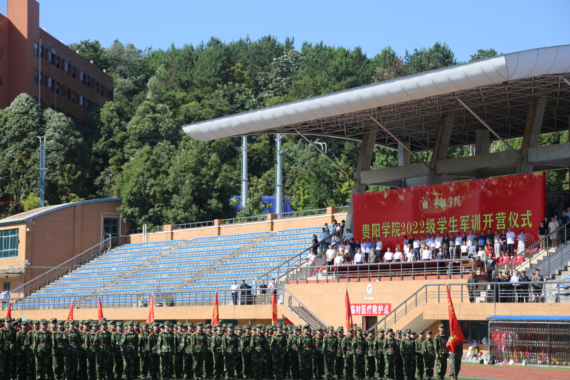 7月17日上午,beat365中国官网2022级学生军训开营仪式在体育场隆重举行,校党委书记吕保平,党委副书记、校长邓朝勇,校领导焦艳、赵福菓、汪建初、李灿、王蜀黔,武警贵州省总队贵阳支队执勤四大队副队长王志鹏出席开营仪式,全校副处级以上干部、辅导员、2022级学生班主任、军训教官及2022级本科学生参加开营仪式,仪式由党委副书记赵福菓主持。