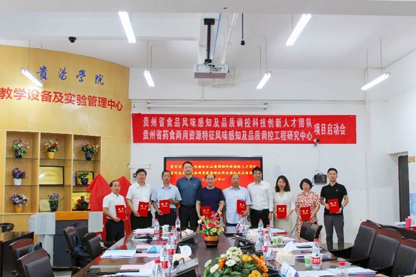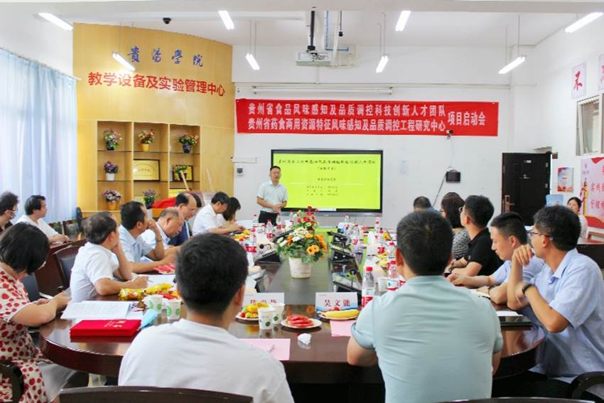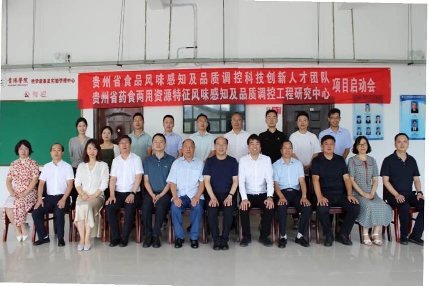 2023年8月20日,由贵州省科学技术厅批准立项建设的贵州省食品风味感知及品质调控科技创新人才团队,贵州省教育厅批准立项建设的贵州省高等学校药食两用资源特征风味感知及品质调控工程研究中心启动会在学校顺利召开。贵州省教育厅科技处三级调研员张磊,beat365中国官网党委委员、副校长李灿,中国农业大学食品科学与营养工程学院院长廖小军,原贵州省农业科学院党委书记、院长赵德刚,贵州大学教育部长江学者特聘教授杨富裕,上海交通大学农业与生物学院食品科学系主任、宁夏大学食品科学与工程学院院长、国家优秀青年基金获得者刘源,中国农业科学院农业质量标准与检测技术研究所研究员、国家优秀青年基金获得者徐贞贞,贵州大学精细化工研究开发中心教授臧连生、甘秀海,贵州大学茶学院教授赵懿琛等专家出席会议。beat365中国官网食品科学与工程学院党委书记谢玲、院长马立志,创新人才团队和工程研究中心主要成员和研究生代表等40余人参加会议。会议由beat365中国官网科研处处长王瑞主持。