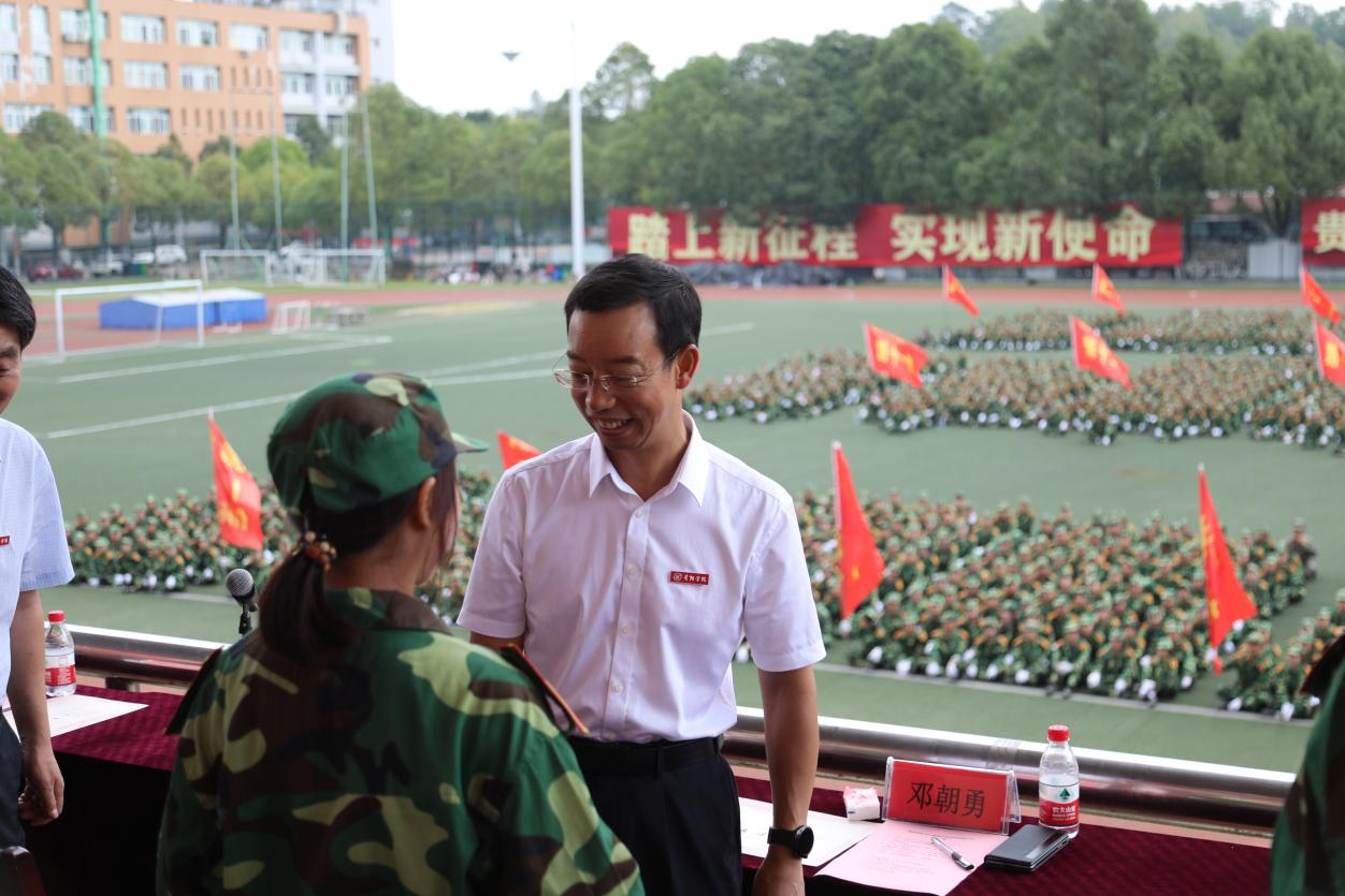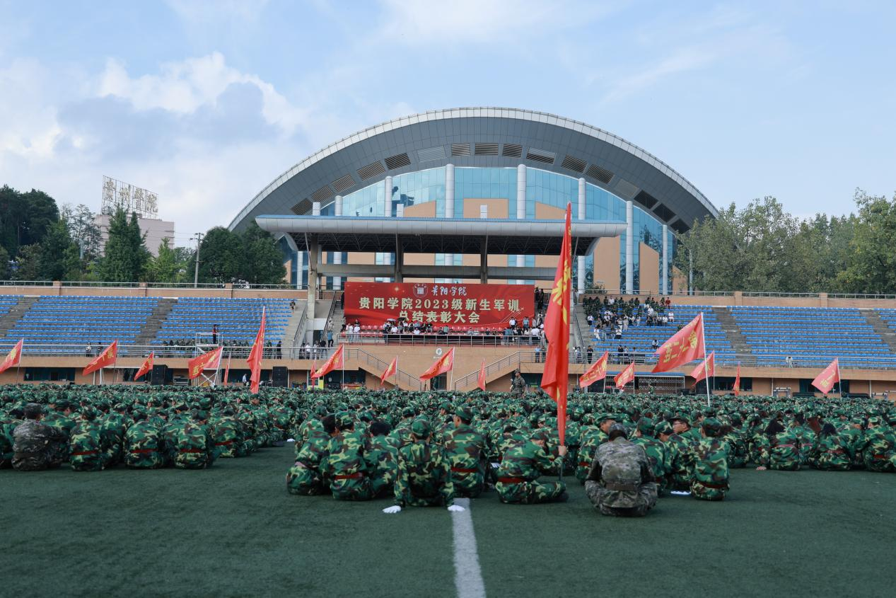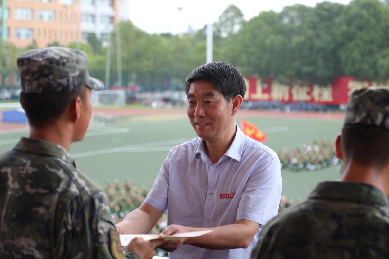 吕保平代表学校向圆满完成军训任务的同学们表示热烈祝贺,向承担军训任务的武警贵阳支队全体教官表示衷心的感谢,向全体带训教师和后勤保障人员致以诚挚的问候。他说,“兵点沙场意气扬,书生本自爱戎装。”军训是大学生涯的一堂必修课,无军训、不成才,无迷彩、不青春。同学们士气高昂、步伐整齐、口号洪亮、军姿严整,精神面貌相较于进校之初发生了巨大变化,这充分展现了大家吃苦耐劳、团结互助的优良作风,充分展现了新时代贵院学子顽强拼搏、昂扬向上的精神面貌,充分展现了“请党放心、强国有我”的坚定信念。同时,他向同学们提出了四点希望:一是心有大我立大志。要在大我中找准“我”的正确坐标,在大志中明确“我”的奋斗目标,在感恩中担当“我”的时代使命。二是锤炼品格明大德。要夯实品德基础,提升精神境界,坚定文化自信,积极参与优秀传统文化的学习和传承。三是勤于求知成大才。对于学习要永葆热爱之心、自律之弦,主动思考、敢于质疑、勇于创新、不断探索,不断开启创新创造之门。四是自信自强担大任。逐梦青春,要有自信自强的坚韧、有矢志奋斗的恒心,拿出青年独有的闯劲和拼劲,面对困境迎难而上,面对责任勇于担当,珍惜时光、不负韶华,在勤学善思、明辨笃行中开创人生的无限精彩。