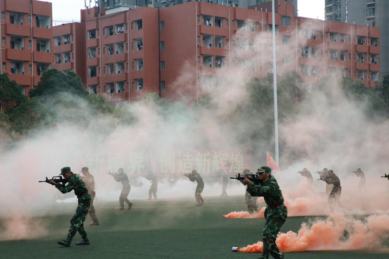 大会在庄严的中华人民共和国国歌声中拉开帷幕,2800余名本科新生及170余名研究生新生经过21天快节奏、高强度的军训后,展示了应急操、擒敌拳、匕首操和战术表演。他们坚毅的目光,敏捷有力的动作,一招一式间尽显飒爽英姿,嘹亮的口号贯穿了操场,观众席上掌声雷动、喝彩不断。同学们以挺拔的军姿、全新的风貌、朝气蓬勃的精神意志展示了军训成果,更体现了对团队配合的磨练和对血性意志的锤炼。