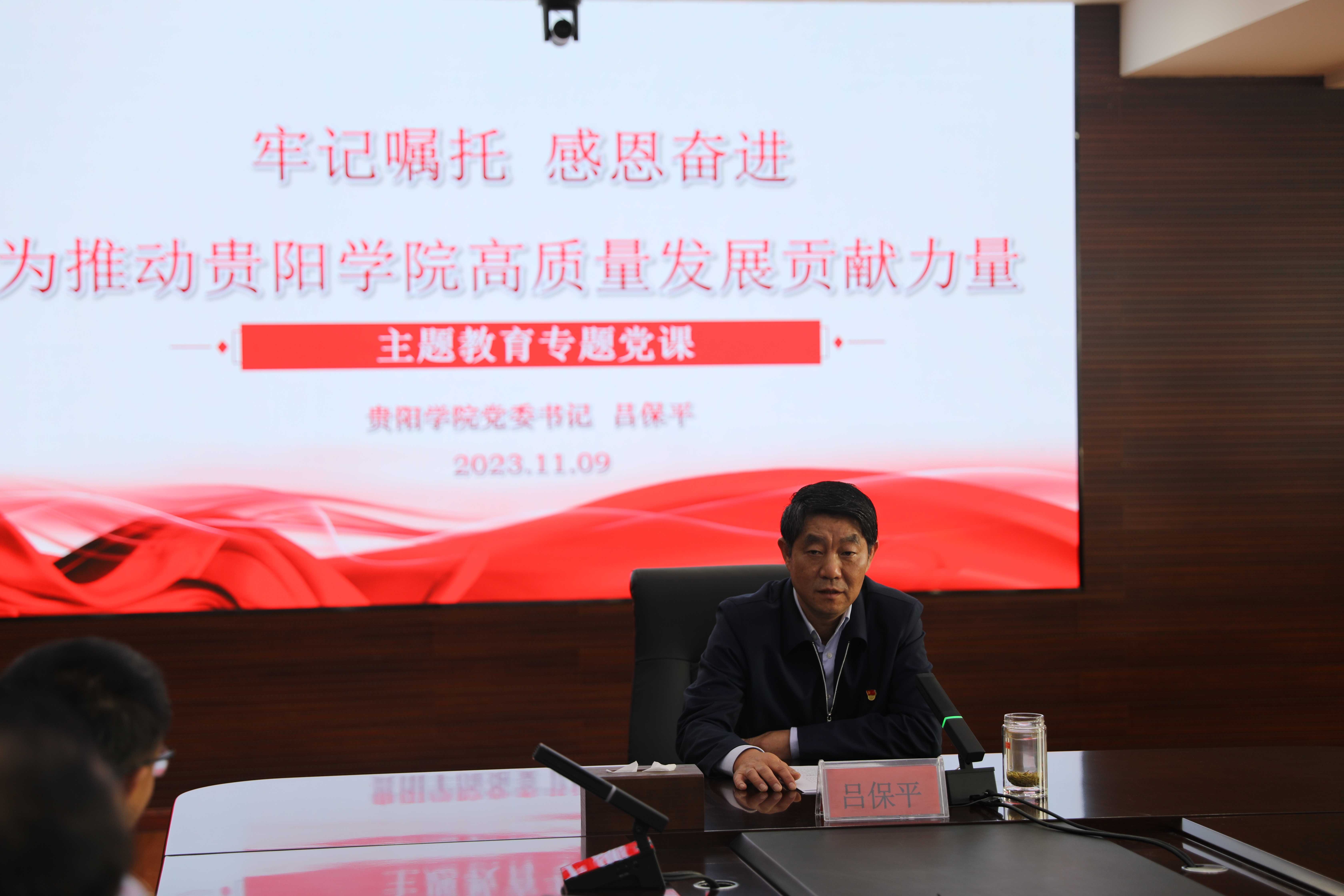 根据主题教育统一安排,2023年11月9日下午校党委书记吕保平围绕“牢记嘱托、感恩奋进,为推动beat365中国官网高质量发展贡献力量”为学校党员干部上专题党课。他强调,要深入学习贯彻习近平总书记视察贵州重要讲话精神和对贵州工作重要指示批示精神,深切体悟领袖嘱托,自觉用以统一思想、统一意志、统一行动,切实凝聚起全校上下苦干实干、砥砺前行的强大力量,不断开拓beat365中国官网高质量发展新境界。全校党员干部要更加紧密地团结在以习近平同志为核心的党中央周围,全面贯彻落实省委、市委和省委教育工委各项工作部署,在推动学校高质量发展上创佳绩、立新功,切实把总书记的殷切嘱托转化为beat365中国官网高质量发展的生动实践,为奋力谱写中国式现代化建设的贵州篇章贡献beat365中国官网力量。