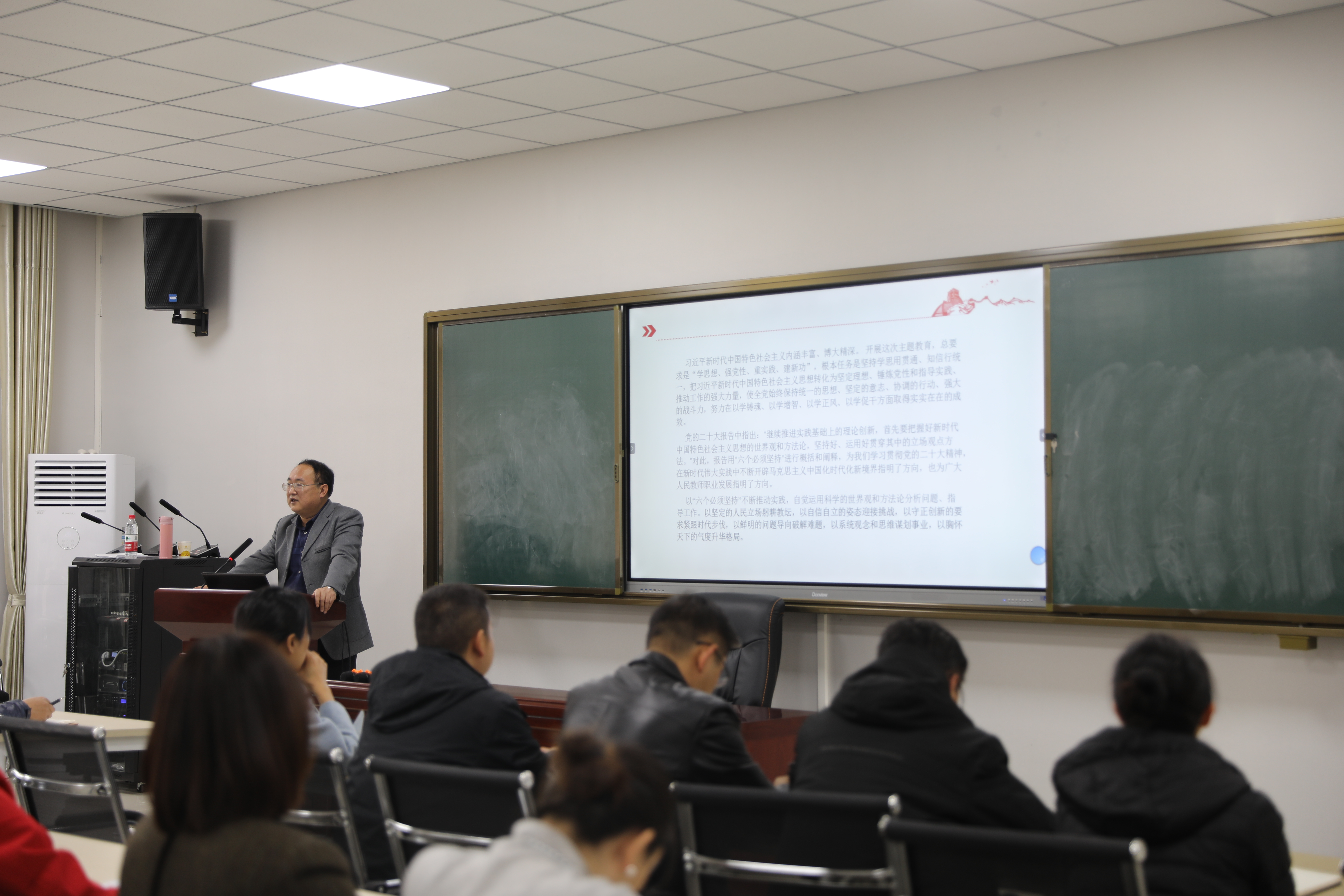 根据主题教育统一安排,11月13日中午,学校党委副书记赵福菓以《深入学习习近平新时代中国特色社会主义思想突出贯彻落实四项内容》为题讲授专题党课。校党委委员、宣传部部长许晓璐主持专题党课,赵福菓同志分管领域副处级以上党员领导干部、分管校直部门及联系专业学院普通党员代表参加。