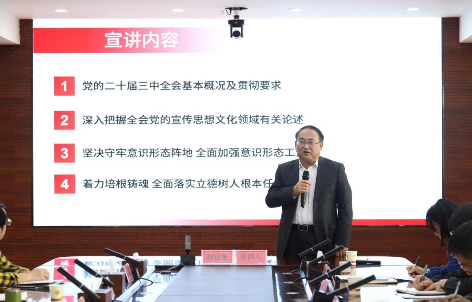 11月11日,赵福菓紧扣党的二十届三中全会精神,结合学校发展实际,从深入把握全会党的宣传思想文化领域论述、意识形态工作、立德树人等方面进行阐释。他要求各级党组织守牢意识形态阵地,遵循相关工作要求,突出马克思主义指导地位,推进理想信念教育常态化制度化。