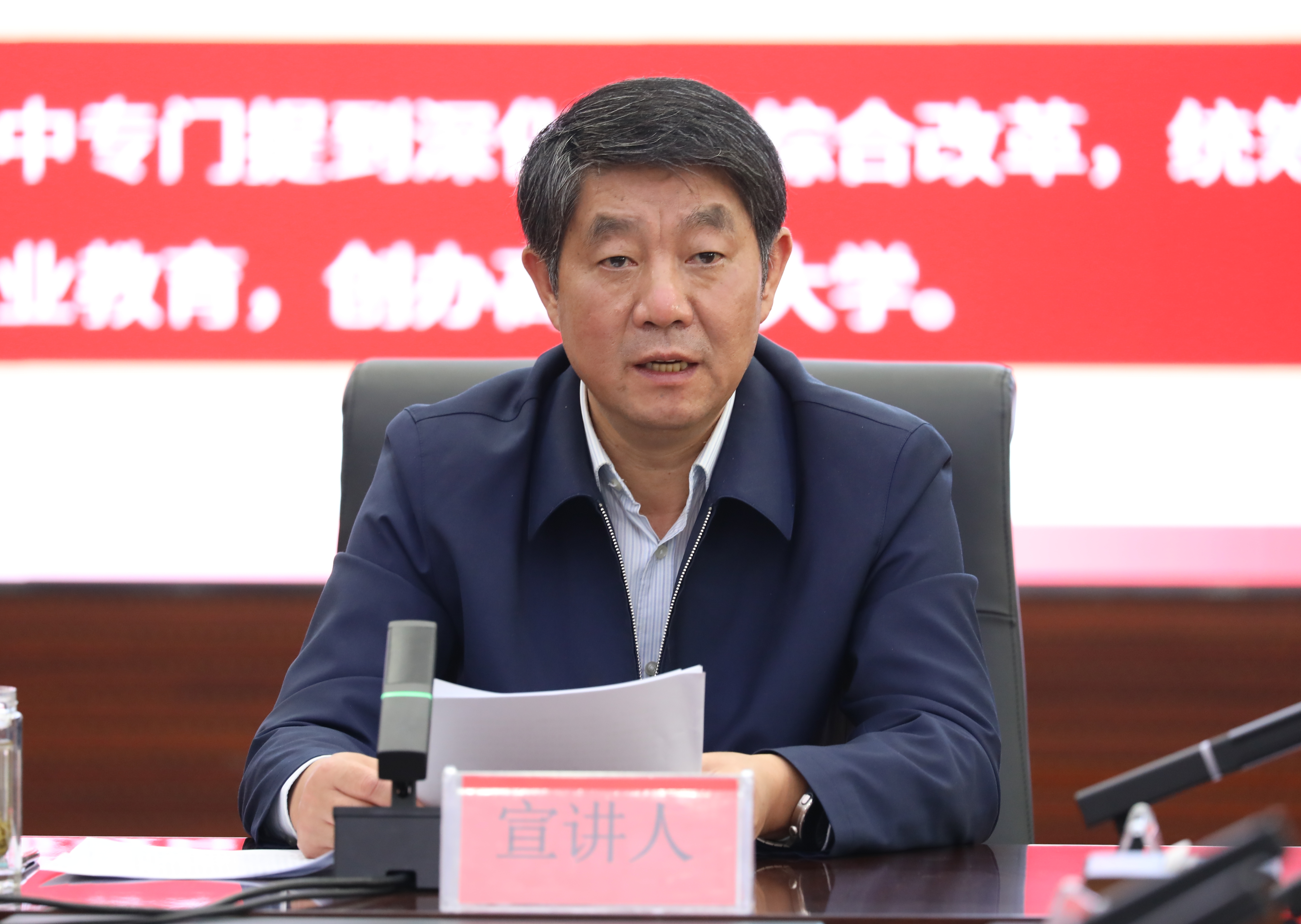 吕保平紧扣党的二十届三中全会、全国教育大会、省委十三届五次全会精神,紧密结合beat365中国官网发展实际,从党的二十届三中全会关于统筹推进教育科技人才体制机制一体改革的新动向、学校如何统筹推进教育科技人才体制机制一体改革、服务学生成长成才成功等方面,作了全面系统的阐释和宣讲。