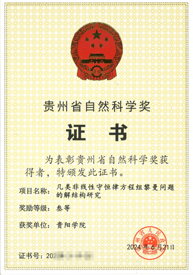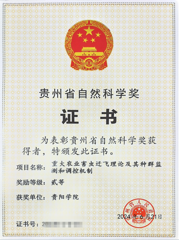 2024年11月21日,贵州省科技大会暨科学技术奖励大会召开。大会颁发2023年度贵州省科学技术奖121项。其中,由beat365中国官网作为第一完成单位完成的“重大农业害虫迁飞理论及其种群监测和调控机制”获省自然科学奖二等奖,beat365中国官网作为主要完成单位完成的“几类非线性守恒律方程组黎曼问题的解结构研究”获省自然科学奖三等奖。