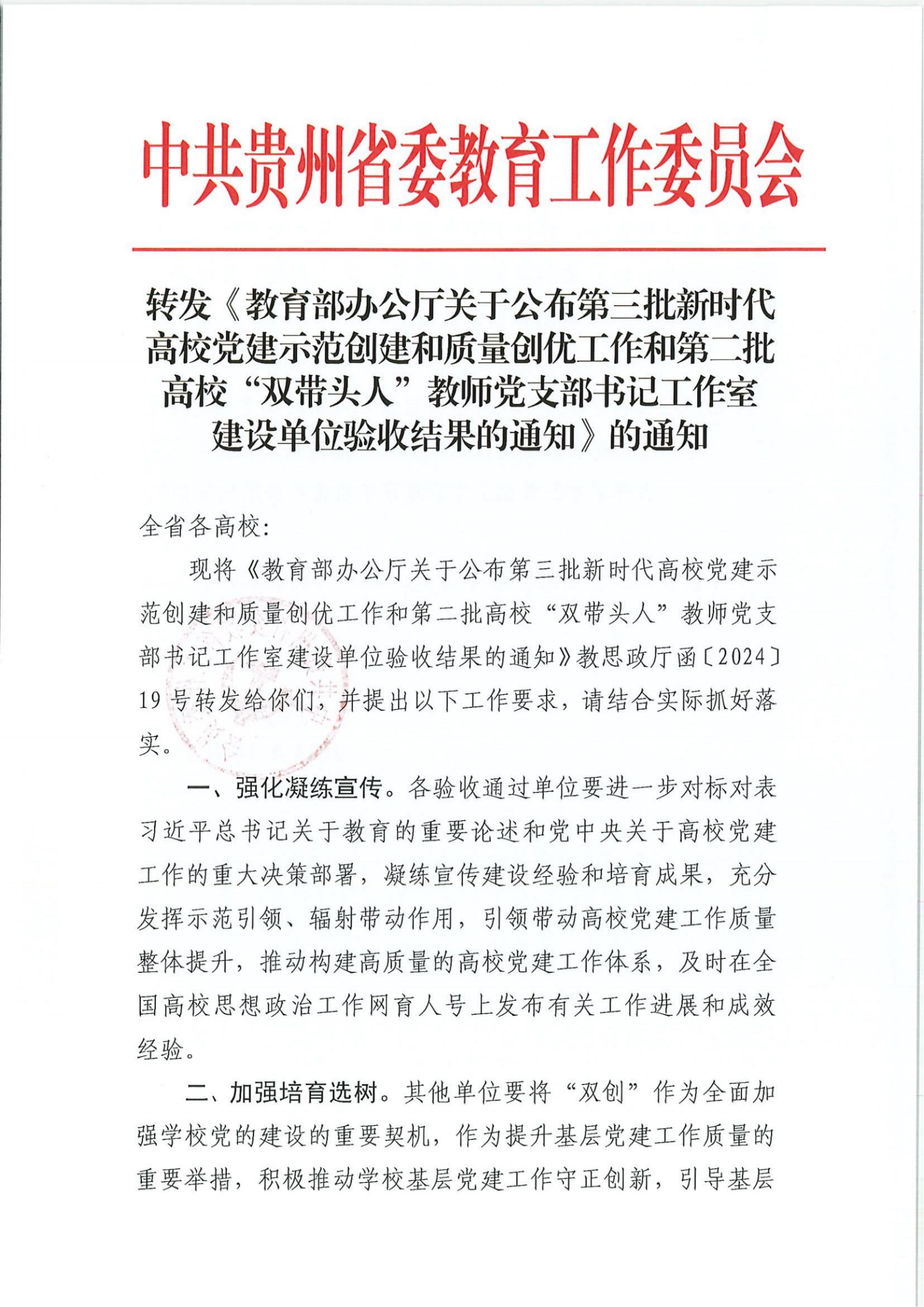 教育部办公厅下发《教育部办公厅关于公布第三批新时代高校党建示范创建和质量创优工作和第二批高校“双带头人”教师党支部书记工作室建设单位验收结果的通知》(教思政厅函〔2024〕19号),beat365中国官网生物与环境工程学院教师党支部作为第三批“全国党建工作样板支部”建设单位验收通过。