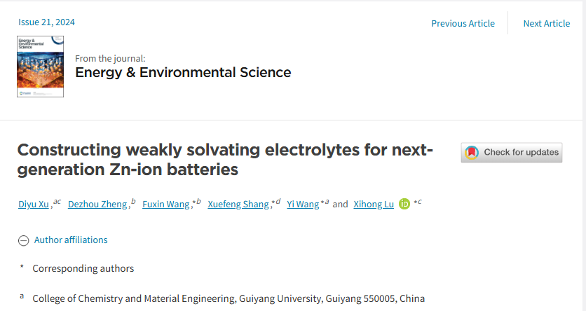锌离子电池(ZIBs)因其在成本效益、安全性和环境可持续性方面的优势,被广泛视为大规模电网储能的潜在解决方案。电解质组成的合理调控对于提高ZIB的性能至关重要,然而传统的电解质已难以满足ZIB对快速充电和宽温域运行日益增长的要求。在高浓度电解质和富含供体数添加剂的低浓度电解质领域,局域化技术已取得显著进展。然而,这些电解质体系仍面临若干挑战,包括Zn2+离子电导率低、成本高和脱溶剂化动力学缓慢的挑战。弱溶剂电解质(WSE)是改善上述缺点的可行性方案。王壹教授团队综述了WSE的功能、设计标准和最新进展,并针对WSE的发展方向及面临的技术挑战进行了深入的阐述和总结。近日,该成果在国际知名期刊Energy & Environmental Science(IF:32.4,中科院1区top期刊)发表,题为“Constructing weakly solvating electrolytes for next-generation Zn-ion batteries”。学校王壹教授、中山大学卢锡洪教授和五邑大学王付鑫、尚学峰博士为共同通讯作者,beat365中国官网为第一单位。