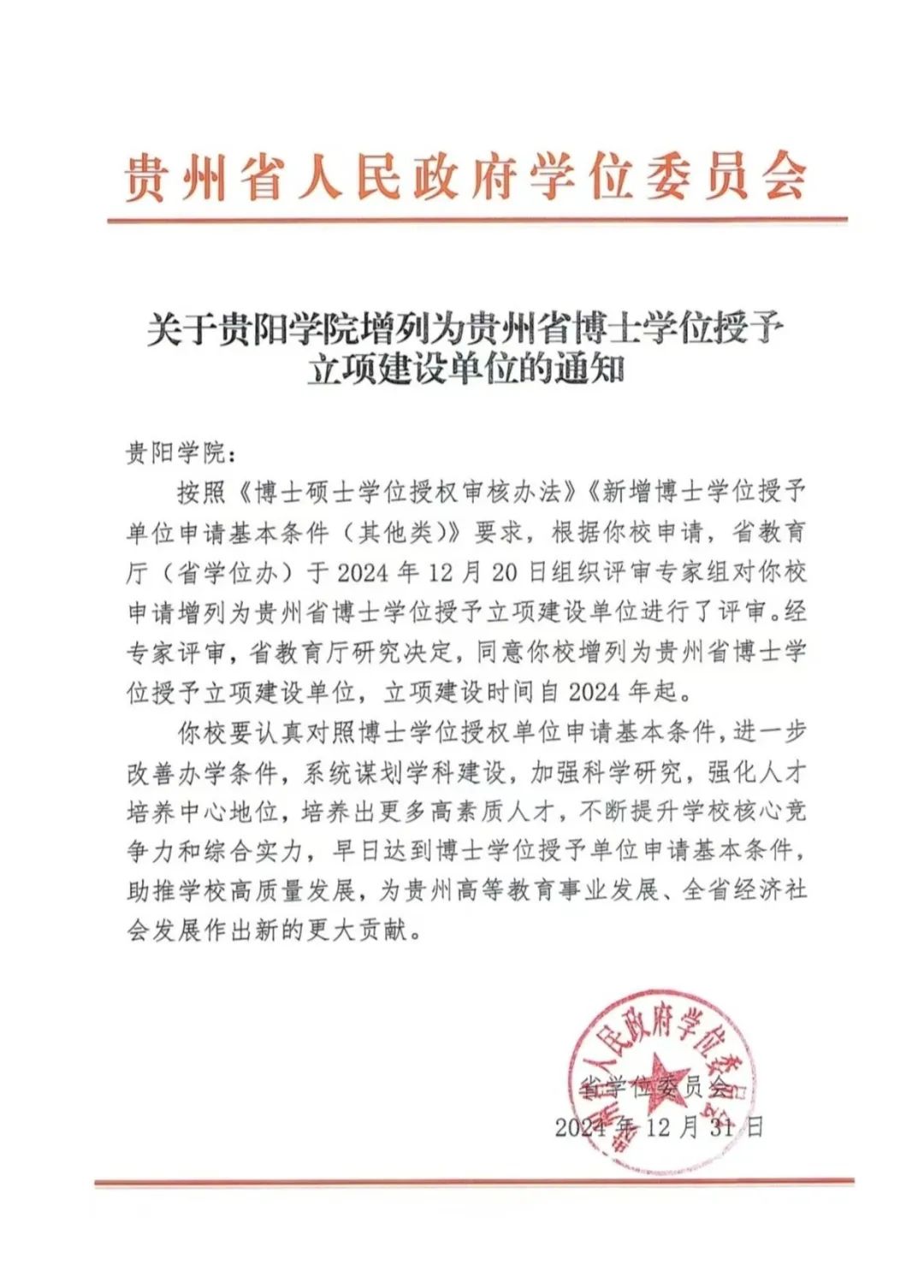 近日,贵州省人民政府学位委员会下发《关于beat365中国官网增列为贵州省博士学位授予立项建设单位的通知》,经专家评审,省教育厅研究决定,同意beat365中国官网增列为贵州省博士学位授予立项建设单位,立项建设时间自2024年起。