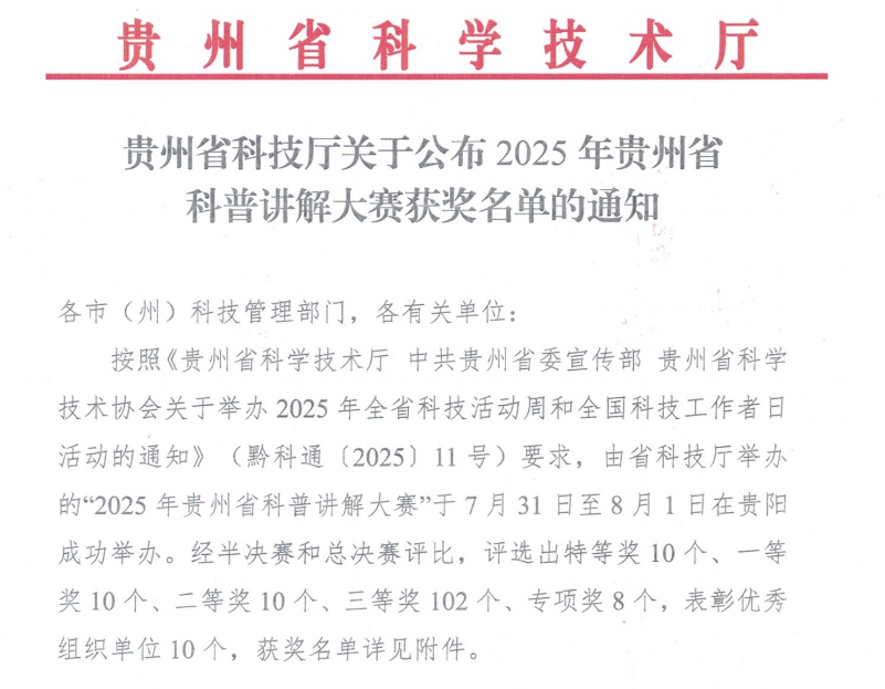 由贵州省科技厅举办的“2025年贵州省科普讲解大赛”于近期公布了获奖名单。经半决赛和总决赛评比,学校师生凭借生动的讲解技巧和新颖的内容设计斩获特等奖1项,三等奖2项。