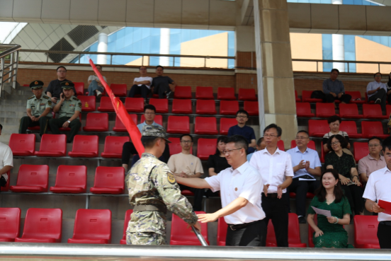 典礼上,黄营向2025级新生军训团团长冉胜岭授旗。军训团团旗迎风飘扬,标志着2025级新生军训正式启动。相信经过军训的洗礼,2025级新生必将以更坚韧的意志、更团结的精神、更饱满的状态,开启大学新篇章,绽放绚丽的青春光芒。