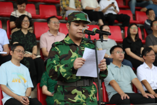 本科新生代表、音乐学专业沈晔玮同学在发言中表达了对大学生活的期待与对军训的理解。他表示,军训是大学意义非凡的“第一课”,是锤炼意志、凝聚团队力量的宝贵机会。他代表全体本科新生承诺,将以“博、新、雅、信”的校训精神投入训练,严守纪律、团结协作,以饱满热情完成军训任务,让汗水成为青春最美的注脚。
