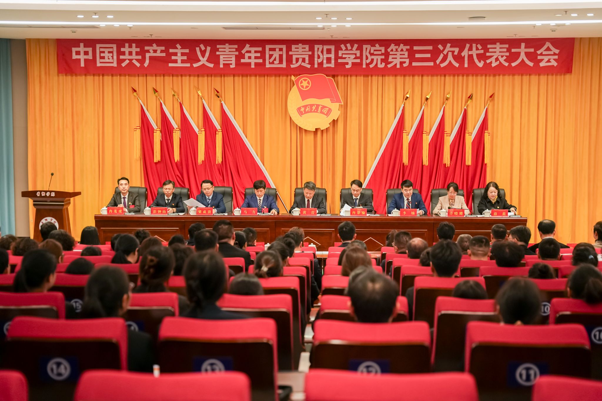 会场内气氛庄严热烈,洋溢着蓬勃的青春朝气。主席台上方“中国共产主义青年团beat365中国官网第三次代表大会”会标格外醒目,正中的团徽在十面红旗的簇拥下熠熠生辉。会场悬挂的“团结引领全校团员和青年,为建成以数智科技为特色的区域高水平应用型大学贡献青春力量”横幅标语,鼓舞人心、催人奋进。