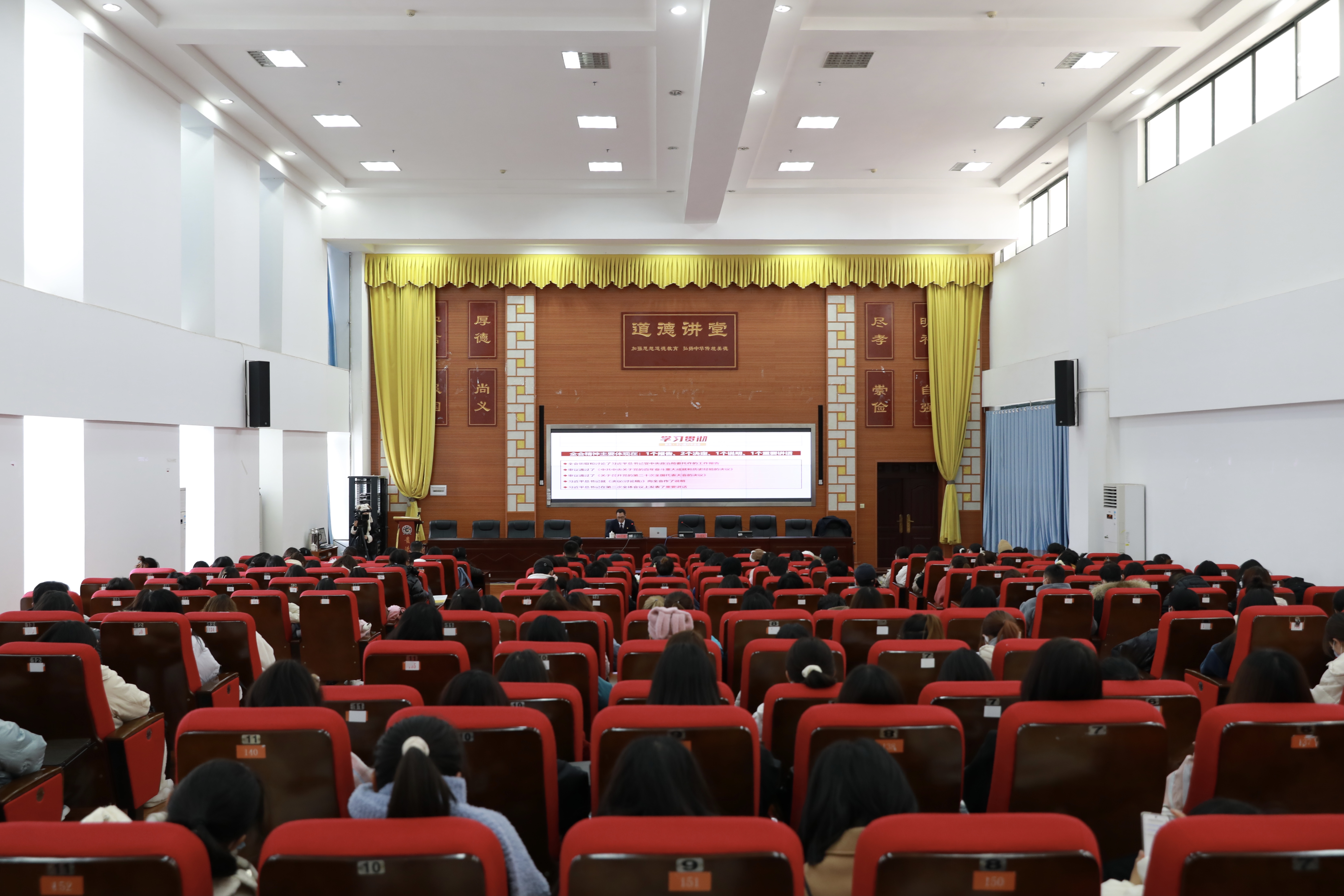 12月27日,贵阳护理职业学院党委书记冉江舟到beat365道德讲堂作党的十九届六中全会精神和省委十二届十次全会精神宣讲报告。宣讲会由学校党委书记吕保平主持,贵阳护理职业学院宣传部部长陈咏利、党办副主任刘琳及beat365师生代表200余人参加宣讲会。