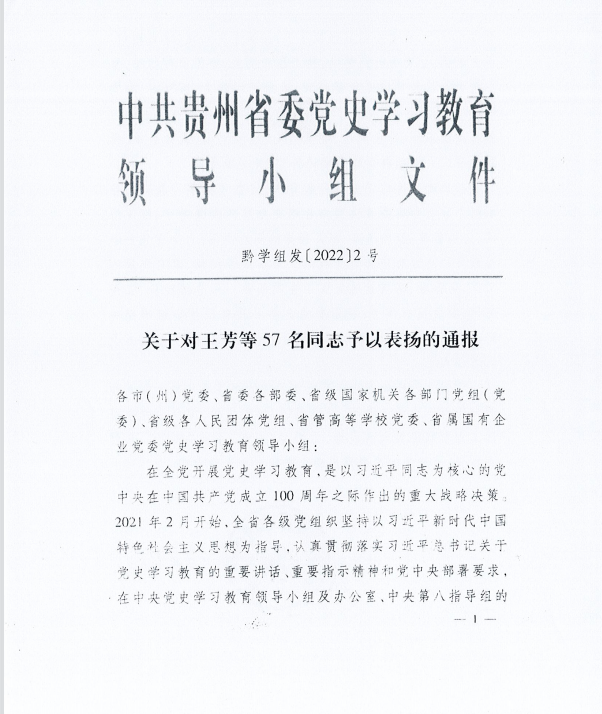 近日,接中共贵州省委党史学习教育领导小组文件《省委党史学习教育领导小组对在党史学习教育工作中表现突出的王芳等57名同志予以通报表扬》,beat365退休老同志、原党委副书记张年举获通报表扬。