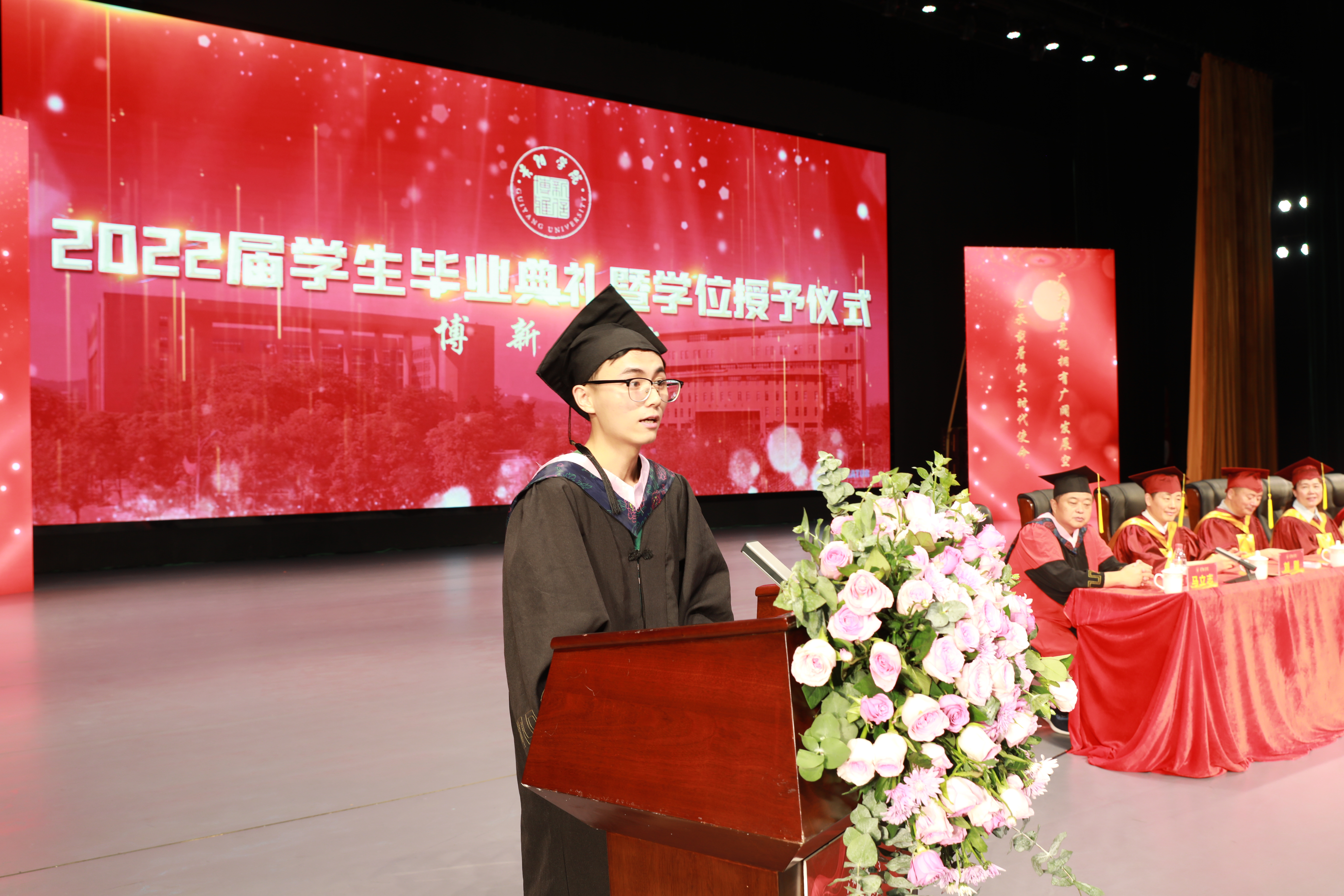 生物与环境工程学院2022届食品工程专业研究生王媛媛作为首届硕士研究生代表发言。她说:“看着从满篇红字的修订模式到最后的优秀毕业论文、手捧毕业证书的今天,感谢自己的坚定理想,感谢老师的不曾放弃,感谢战友的不曾抛弃!作为beat365中国官网的首届研究生,是幸运的更是幸福的。每个踏着星光从实验室回寝的深夜,有一盏灯永远为我们而亮,让我们科研之路孤单却不孤独。请母校放心,未来我们定将初心如磐,奋楫笃行,用‘贵院’人的力量,拥抱祖国、奋勇前进。我们即将远行,分别在即。请大家永远记得,无论我们身在何方,永远都是beat365中国官网一直牵挂的孩子!祝愿母校蒸蒸日上,再书硕果;祝愿老师工作顺利,桃李满疆;祝愿2022届的各位毕业生业有所成,前程似锦!”