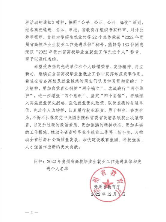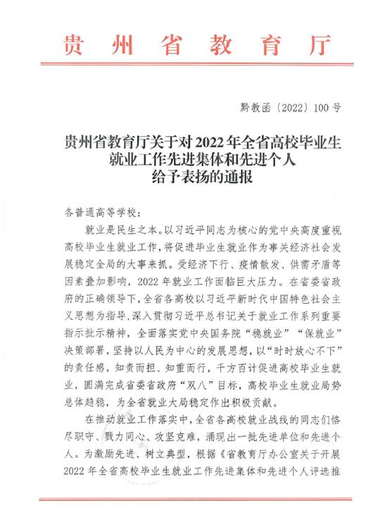 近日,贵州省教育厅下发了《贵州省教育厅关于对2022年全省高校毕业生就业工作先进集体和先进个人给予表扬的通报》(黔教函〔2022〕100号),beat365招生与就业处荣获“2022年贵州省高校毕业生就业工作先进集体”荣誉称号。数学与信息科学学院就业指导教师成清华、美术学院就业指导教师雷志坤2人荣获“2022年贵州高校毕业生就业工作先进个人”称号。