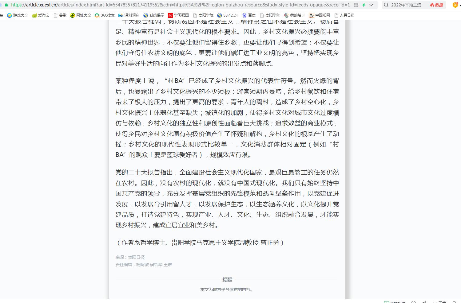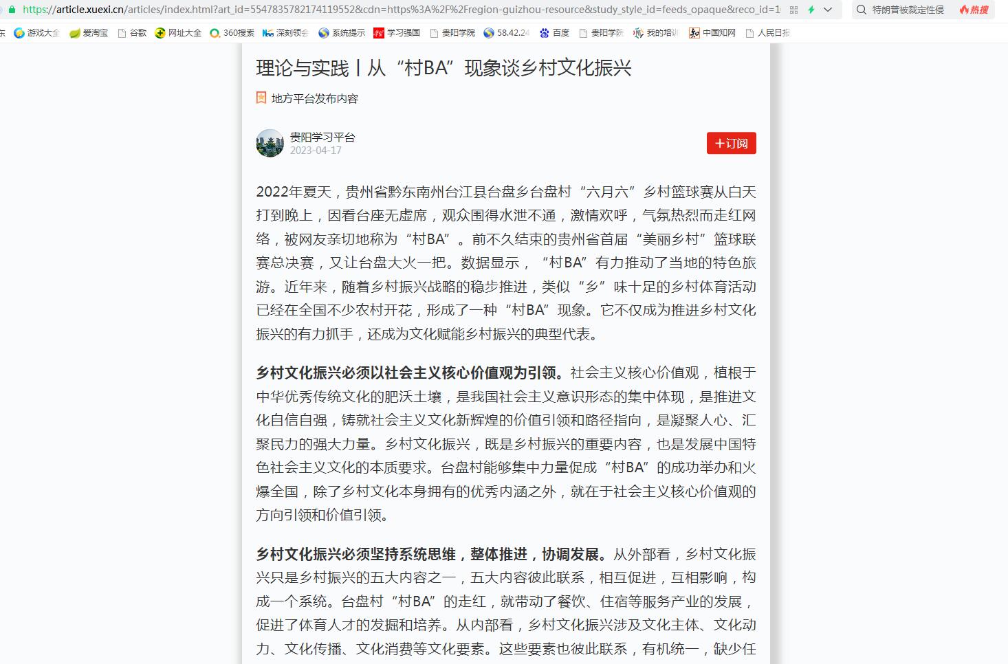 2023年4月17日,beat365马克思主义学院副教授曹正勇在贵阳日报发表的文章《从“村BA”现象谈乡村文化振兴》被“学习强国”贵阳学习平台采用。