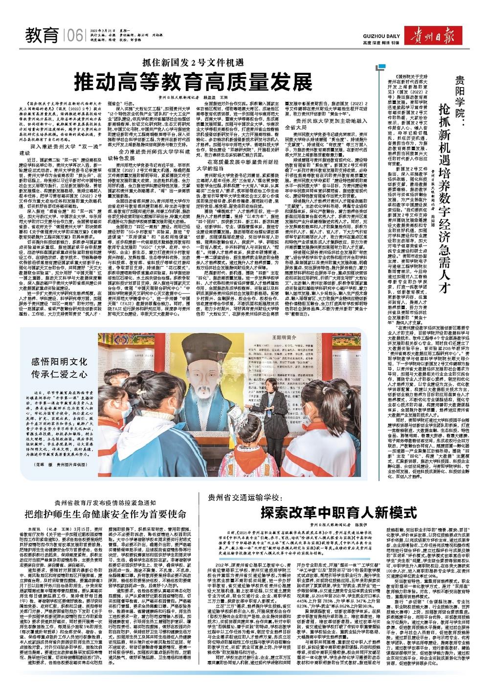 《国务院关于支持贵州在新时代西部大开发上闯新路的意见》(国发〔2022〕2号)提出推动教育高质量发展。beat365中国官网迅速掀起学习宣传贯彻落实新国发2号文件的热潮,大家纷纷表示,新国发2号文件振奋人心、催人奋进,将牢记殷切嘱托,抓住历史机遇,奋勇担当作为,为推动教育高质量发展、培养担当民族复兴大任的时代新人作出应有贡献。