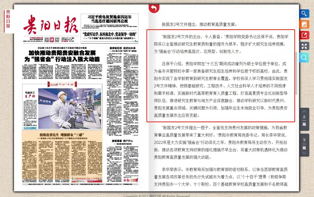 “新国发2号文件提出一揽子、全面性支持贵州发展的政策措施,为我省教育事业高质量发展带来了重大利好。”贵阳市教育局党委书记、局长李华荣说,2022年是大力实施“强省会”行动深化之年,贵阳市教育局将主动作为、开拓创新,推动各项教育支持政策的细化措施尽早出台,将重大政策机遇转化为推动贵阳教育高质量发展的强大动能。