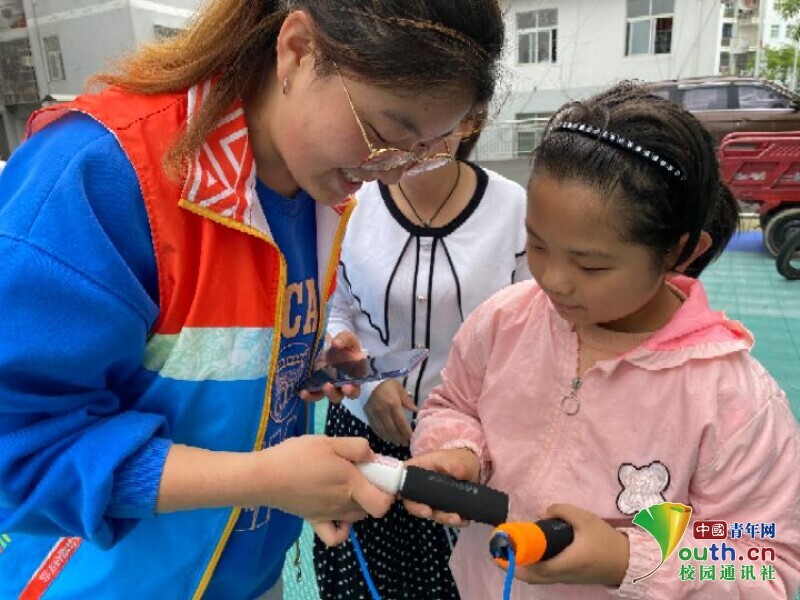图为社工实践队队员为社区青少年讲解如何调节跳绳。中国青年网通讯员 郑雪莲 供图