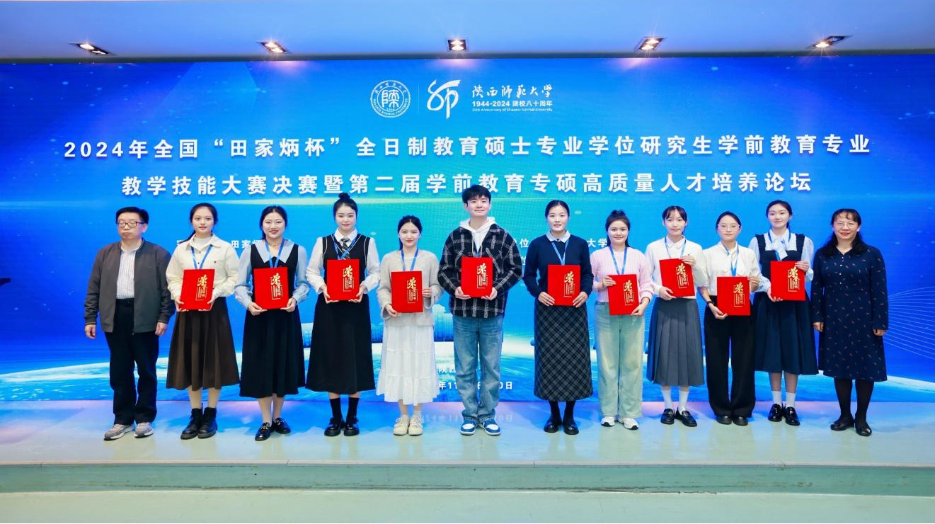 2024年11月9日-10日,全国“田家炳杯”全日制教育硕士专业学位研究生学前教育专业教学技能大赛决赛在陕西师范大学落下帷幕。经过激烈角逐,beat365教育科学学院学前教育专业五名研究生凭借扎实的专业知识、过硬的教学技能在比赛中脱颖而出,共获一等奖2项、三等奖3项,教育科学学院2名教师获得优秀指导教师奖。