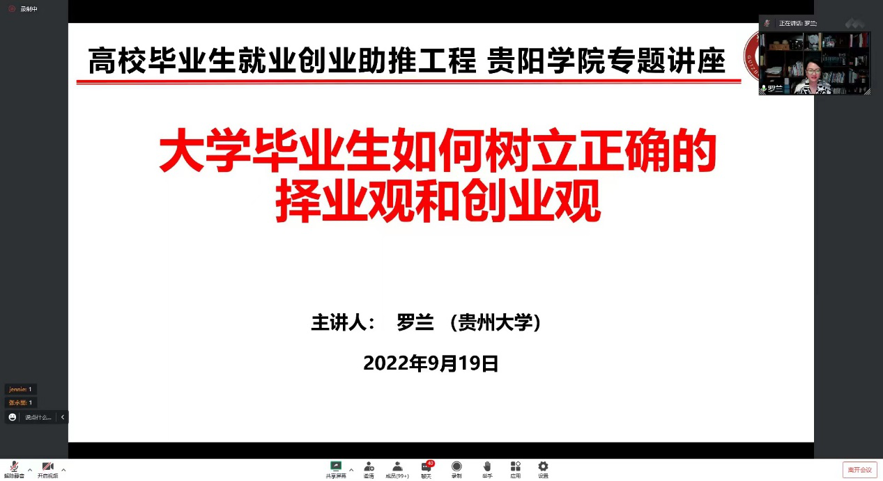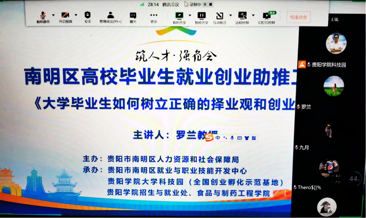 2022年9月19日,在南明区人力资源和社会保障局的支持下,由beat365中国官网大学科技园管理中心(全国创业孵化示范基地)、beat365中国官网招生与就业处、食品与制药工程学院联合举办了“筑人才·强省会”南明区高校毕业生就业创业助推工程线上讲座,讲座邀请了贵州大学管理学院创新创业中心副主任罗兰教授为200余名毕业生分享《大学毕业生如何树立正确的择业观和创业观》。