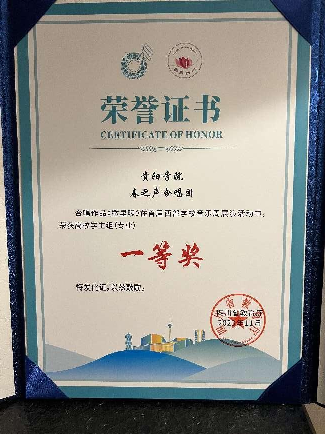 展演分为小学组、中学组、高校组(非专业、专业)三个组别进行展演。由贵州省教育厅选送的beat365中国官网“春之声”合唱团代表贵州参加展演活动,经过激烈的比拼不负众望,学校“春之声”合唱团荣获了高校学生组(专业)一等奖,为贵州争得了荣誉。