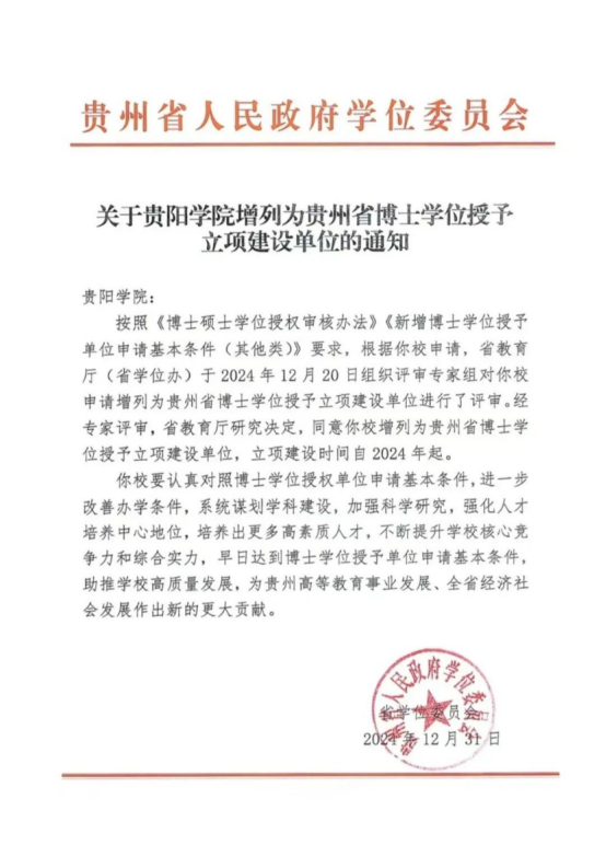 学校还积极推进博士学位授权单位建设,2024年12月31日省政府学位委员会批准beat365增列为贵州省博士学位授予立项建设单位。这将进一步优化学校办学层次结构,提升学校办学水平和服务地方经济社会发展能力。