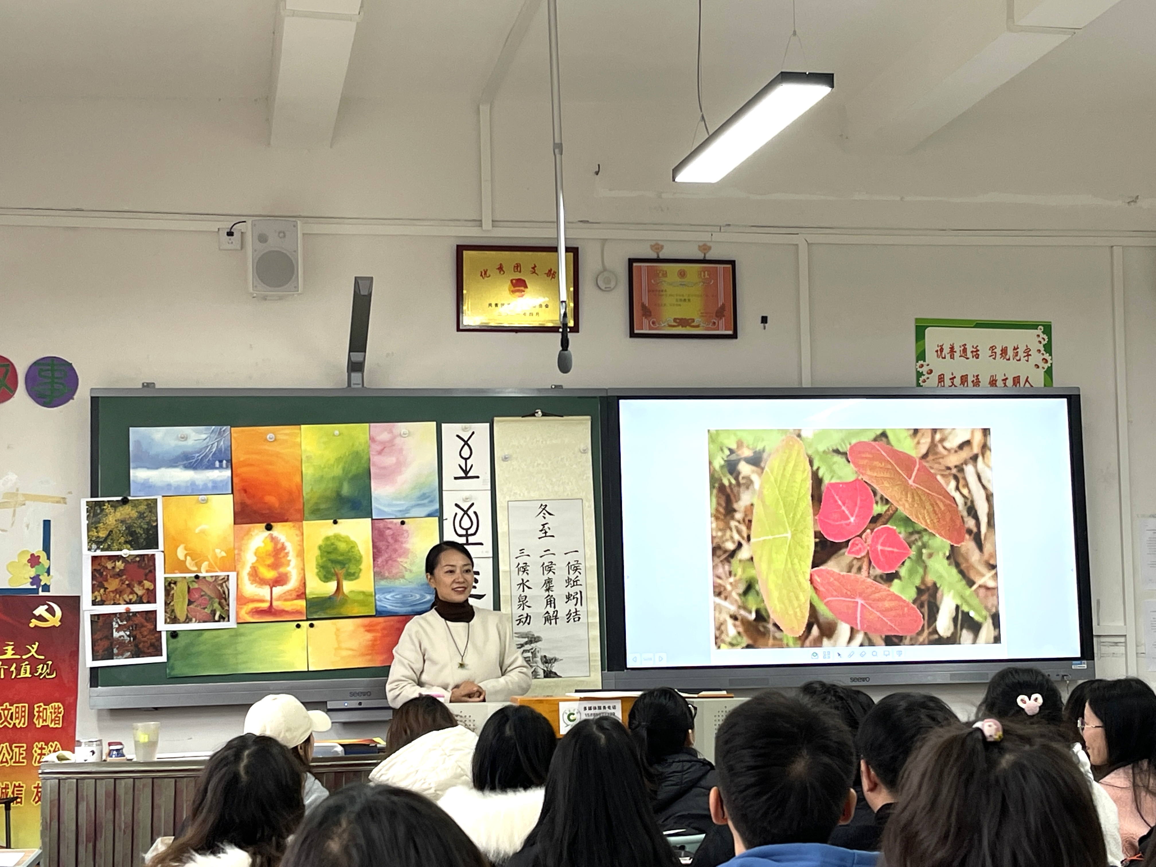 二十四节气蕴含在四季之中,其色彩是不同的,刘漫丽向同学们展示了不同地区秋季图景,讲述了树叶从嫩绿变黄,再变为深红的过程。她说道:“树的生命是短暂的,但它却拥有属于自己的颜色,同学们也要像大树一样,找到自己的颜色,实现自己的人生价值。”