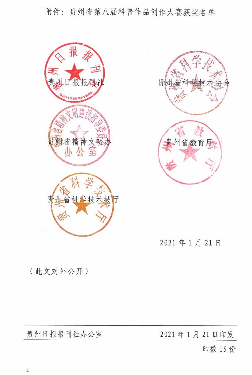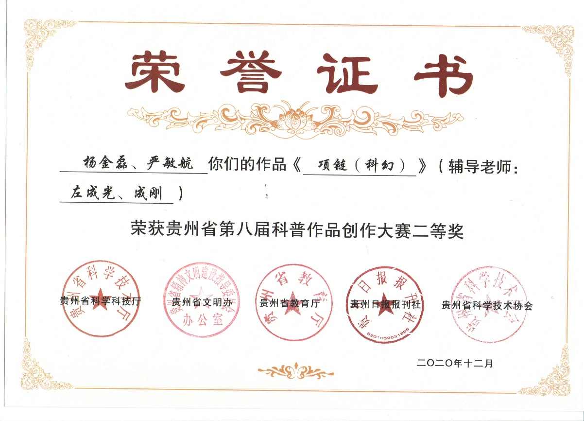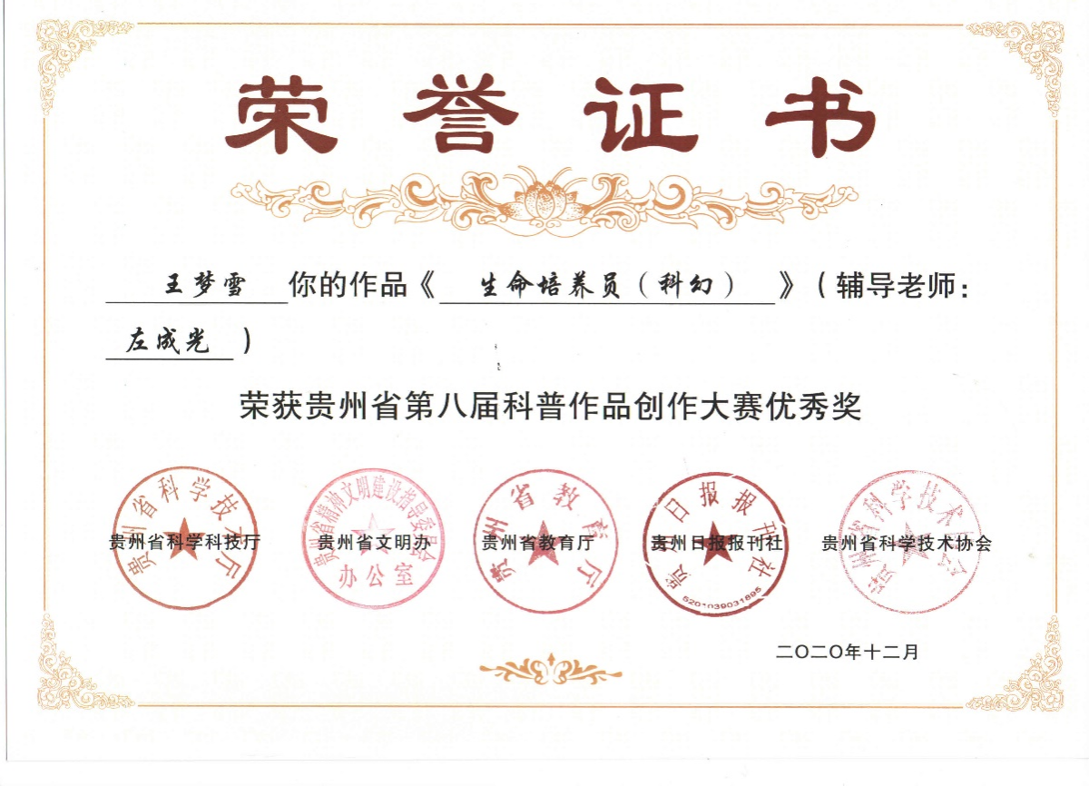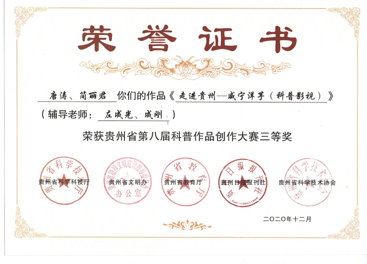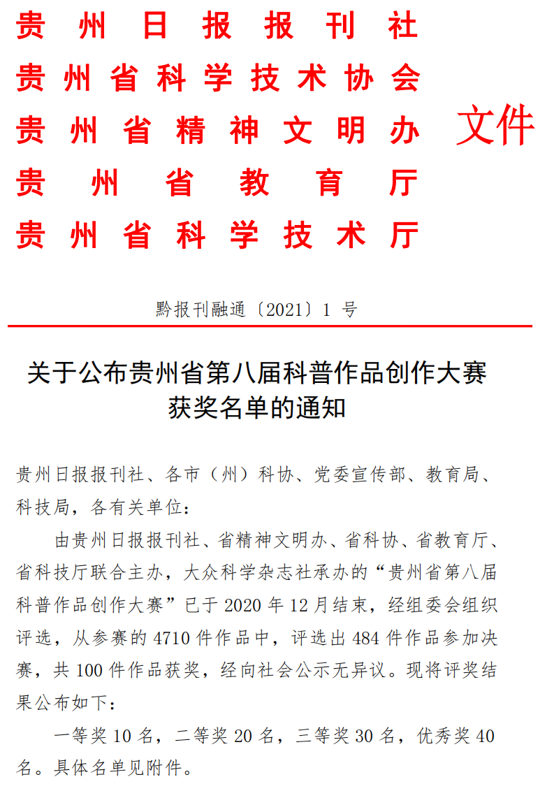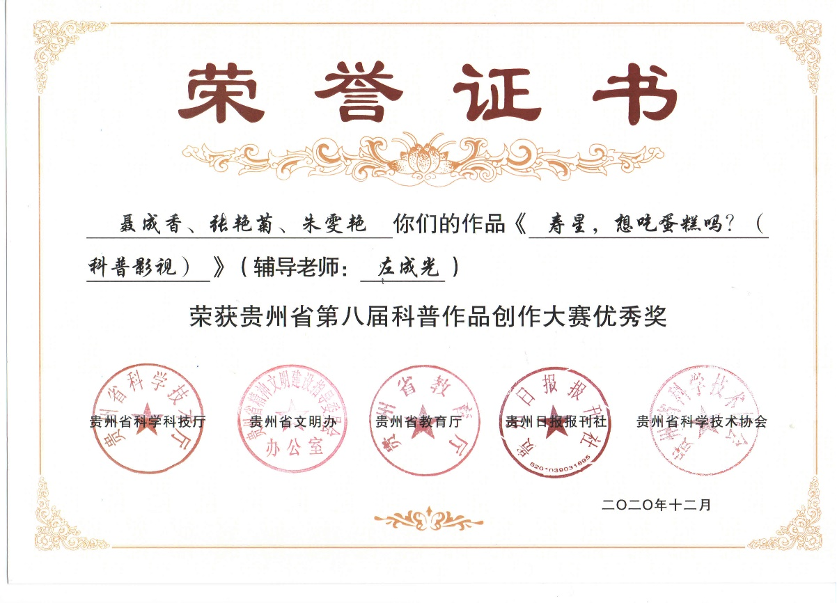 由贵州日报报刊社、省精神文明办、省科协、省教育厅、省科技厅联合主办了“贵州省第八届科普作品创作大赛”。于2020年12月已结束,为提高化学与材料工程学院科学教育专业师范的科普创作能力,为今后指导中小学生进行科普作品创作积累经验,科学教育教研室精心组织此次比赛。经组委会评选,全省共有4710件作品参赛,评选出484件作品参加决赛,最终共100件作品获奖。科学教育专业教师左成光和成刚指导的学生获得了可喜的成绩,共8人获奖。其中,获得二等奖2人、三等奖2人、优秀奖4人。