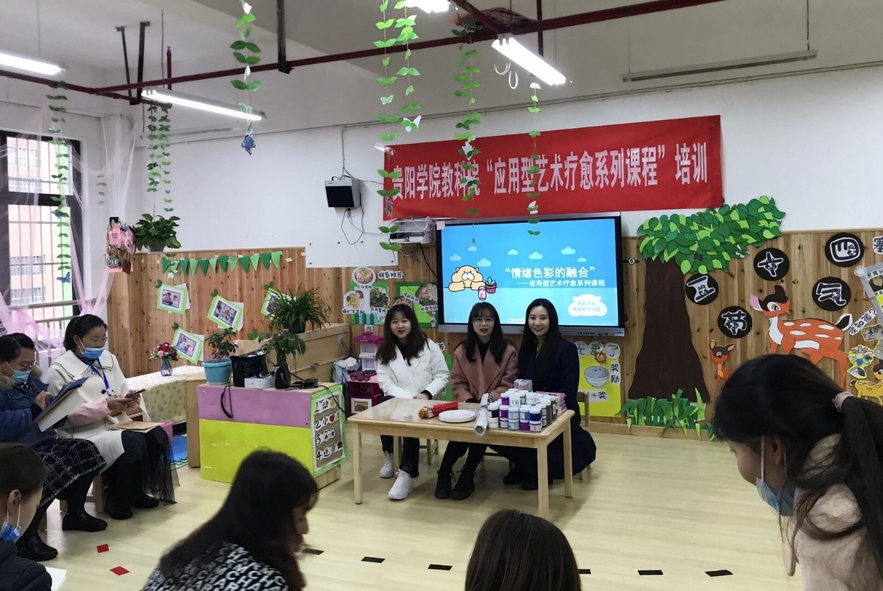 2020年11月26日中午,beat365中国官网颜媛、刘蕾、彭麟等三位老师前往开阳县蒋家寨幼儿园开展“应用型艺术疗愈系列课程”培训,参会的有幼儿园园长熊汝梅、挂职副园长袁媛、幼儿园全体幼教老师以及10名beat365中国官网学前教育专业的实习学生。