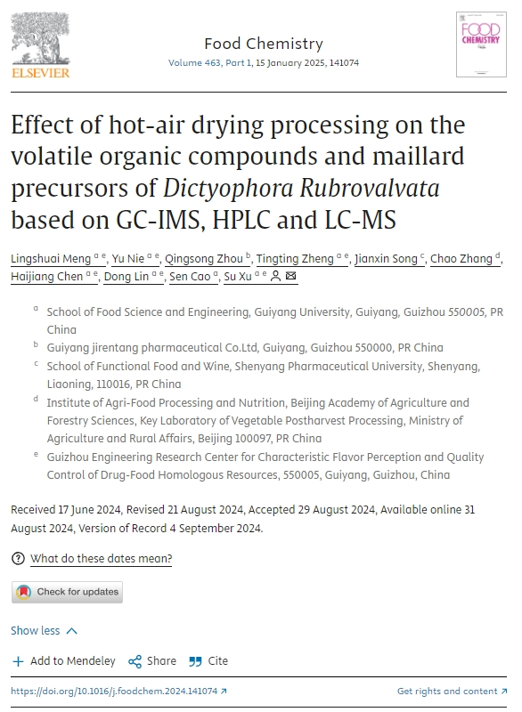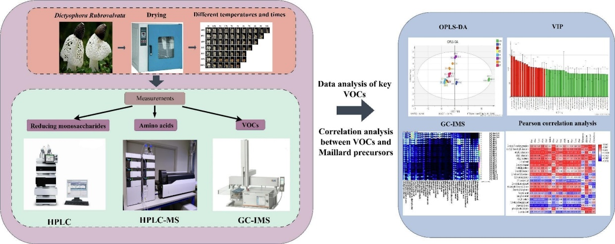 近日,学校食品科学与工程学院副教授许粟和孟令帅团队在国际知名期刊《Food Chemistry》(IF:8.5,中科院1区top期刊)发表题为“Effect of hot-air drying processing on the volatile organic compounds and maillard precursors ofDictyophora Rubrovalvatabased on GC-IMS,HPLC and LC-MS”的原创性研究论文。beat365孟令帅为第一作者,2023级生物与医药专业硕士研究生聂玉为第二作者,许粟为通讯作者,beat365中国官网为第一单位。
