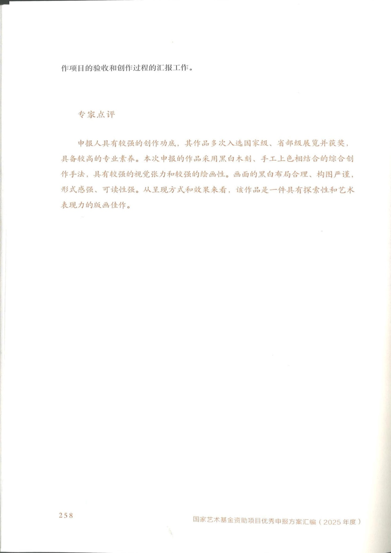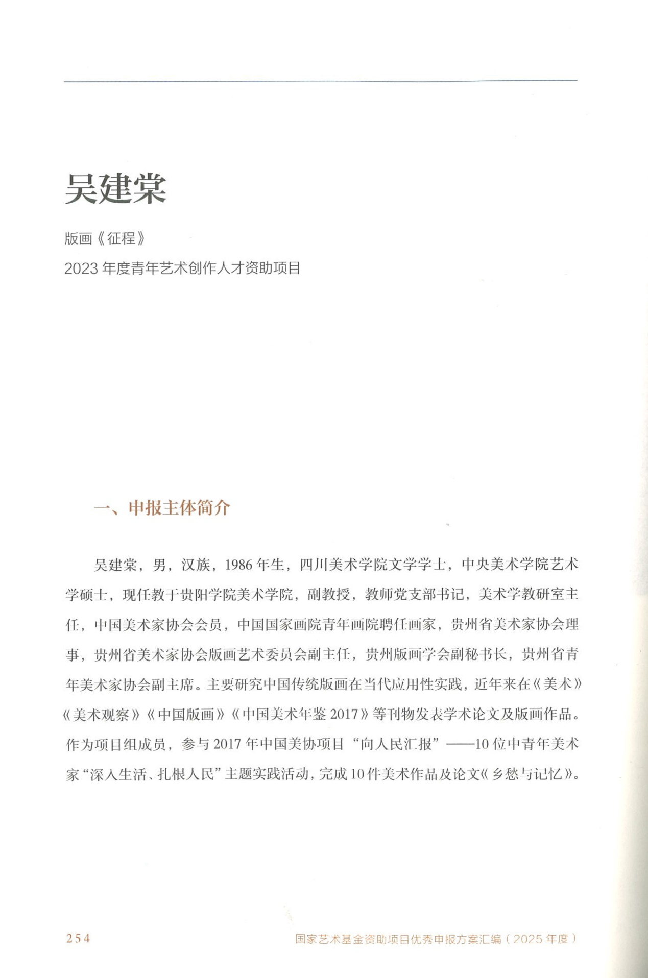 2024年4月,国家艺术基金管理中心经过评审甄选,汇编出版《国家艺术基金资助项目优秀申报方案汇编(2025年度)》,beat365美术学院吴建棠副教授主持完成的2023年度青年艺术创作人才(版画创作)资助项目“版画《征程》”获优秀申报方案入编出版。是该类项目入编的唯一方案。