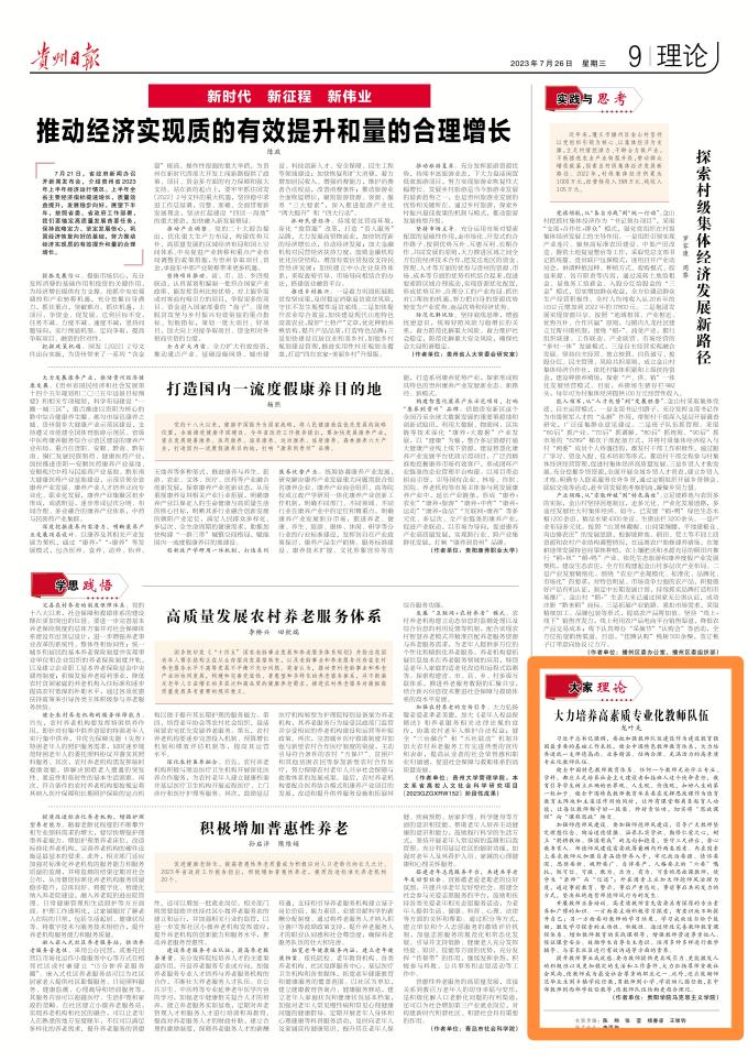 2023年5月29日,中共中央政治局就建设教育强国进行第五次集体学习,习近平总书记关于建设教育强国的重要讲话精神和党的二十大报告中“实施科教兴国战略,强化现代化建设人才支撑”的论述一以贯之。为全面领悟习近平总书记关于建设教育强国的重要讲话精神,beat365马克思主义学院教师围绕习近平总书记关于建设教育强国这一重要论述开展研究阐释工作,其中龙叶先的理论文章《大力培养高素质专业化教师队伍》发表在贵州日报理论版,原文如图。